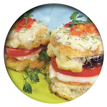 - Затем положить на тарелку кружок баклажана, намазать смесью майонеза и чеснока (через пресс), положить кружок помидора, снова – баклажан, майонез с чесноком.