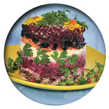 - Выложить салат слоями, промазывая каждый майонезом: мясо, лук, картофель, яйца, морковь, чернослив, свекла.