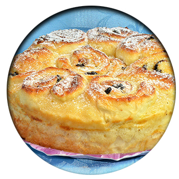 - Прикрыв пирог полотенцем, оставить его на расстойку на 10-15 минут. Затем сверху смазать взбитым желтком и поместить в разогретую до 180 градусов духовку. Выпечь до готовности. Остудить. Посыпать сахарной пудрой.