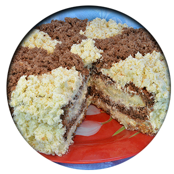 - Деревянной палочкой разделить на сектора. Заполнить крошкой, чередуя тёмную и светлую. Торт готов.