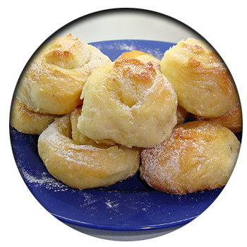 - Выложить булочки на смазанный растительным маслом противень и печь при температуре 180 градусов до золотистой корочки. Готовые булочки выложить на тарелку и посыпать сахарной пудрой.