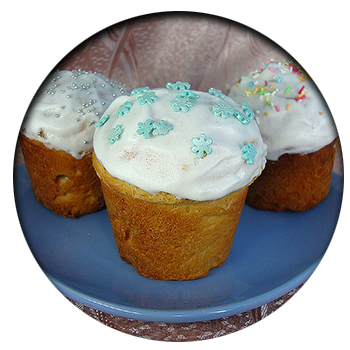 - Остудить, вынуть из формы. Смазать глазурью (взбить белок, добавить несколько капель лимонного сока, просеянную сахарную пудру). Посыпать кондитерской посыпкой. Подать к столу.