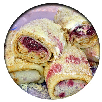 - На каждый блин положить консервированные вишни. Завернуть. Сметану взбить с сахаром (по вкусу) и смазать блинчики.