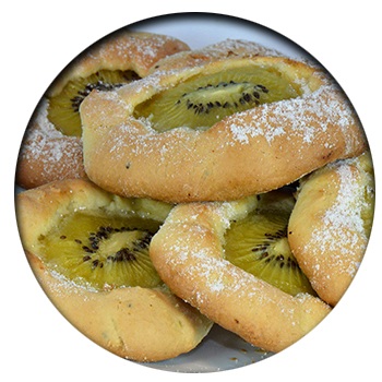 - Тесто разделить на кусочки, из каждого кусочка сформировать лепёшку. Уложить на лепёшки по кружочку киви, защипать края.