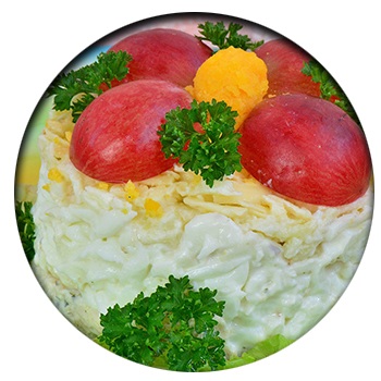 - Виноград без косточек разрезать на половинки и красочно оформить ими поверхность салата.