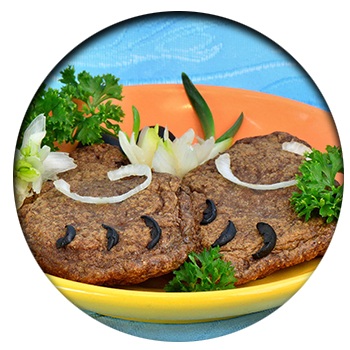 - Выложить готовые оладьи на блюдо. С одного края каждой оладьи положить по кружочку лука. С другой стороны сделать «когти» из полосок маслин. Украсить зеленью, цветами из лука, овощами.