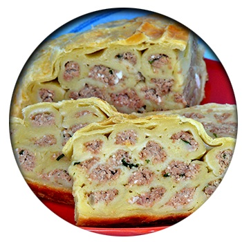 Слоёное тесто готовое – 500 г, растительное масло для жарки. Для фарша: говядина – 150 г, свинина – 100 г, лук – 0,5 шт., зелень (укроп, петрушка, кинза) – 1 пучок, соль, перец – по вкусу, яйца – 4 шт., шампиньоны – 4 шт. Для смазки: яйцо – 1 шт., молоко – 30 мл.