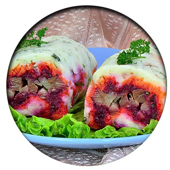 - На целлофан, слегка смазанный растительным маслом, разложить картофельную массу, на неё положить свёклу, морковь, сверху выложить полоски сельди.