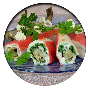 - Оставшихся рыбок уложить рядом. Украсить майонезом, зеленью. Можно сделать с другими начинками.