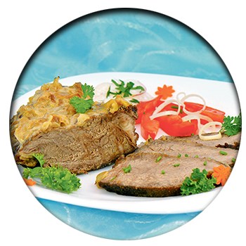 - Перед подачей нарезать мясо ломтиками, полить соусом и подать на стол, украсив блюдо свежими овощами.
