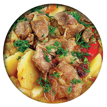 Мясо индейки – 700 г (можно свинину или баранину), картофель – 7 шт., помидоры – 4 шт., морковь – 1 шт., лук – 2 головки, капуста – 700 г, чеснок, острый перец – 1 шт., зира, кориандр, болгарский перец, зелень.
