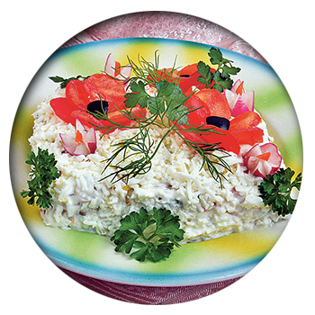 - Заправить кремом салат. Сверху посыпать тёртым белком. Украсить по желанию.