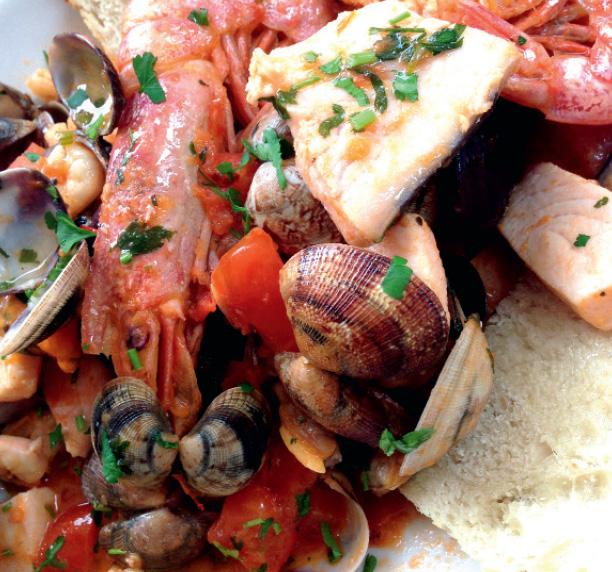 Паста из твердых сортов пшеницы, морепродукты (мидии, вонголе, кальмары, креветки, филе трески), петрушка, чеснок, тимьян, розмарин, томаты черри, белое вино, лук-шалот, сливочное масло, белый хлеб.