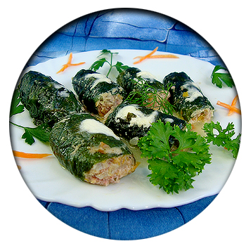 - Листья черемши тщательно вымыть. На каждый листик выложить немного фарша и свернуть трубочкой. Если листья крупные, то можно свернуть конвертиком.