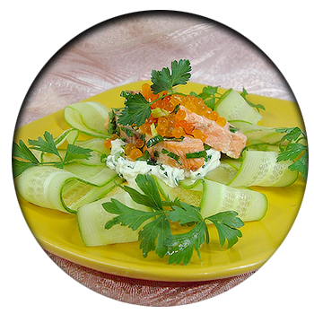 250 г лосося, 3 ст. ложки подсолнечного масла, 1 ст. ложка столового уксуса, 2 свежих огурца, красная икра – 100 г, 50 г сметаны, зеленый лук, петрушка.