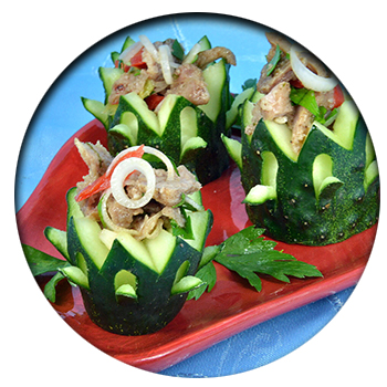 - Наполнить каждую огуречную чашечку мясным салатом и выложить на блюдо. Сверху украсить маленькими веточками петрушки.