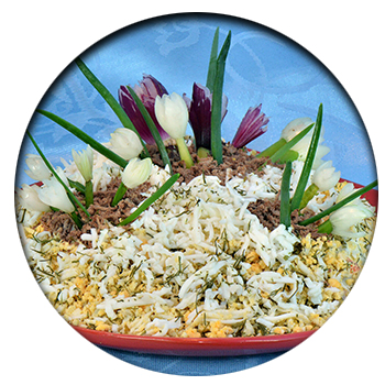 - Для оформления: яйцо натереть на мелкой тёрке, добавить зелень, украсить бока салата. Верх салата украсить белком и варёной печенью (сделать «проталины»),натёртыми на мелкой тёрке. Из лука сделать цветы: маленьким ножиком вырезать зубчики, луковицы надеть на деревянные палочки, сверху – перо зелёного лука.