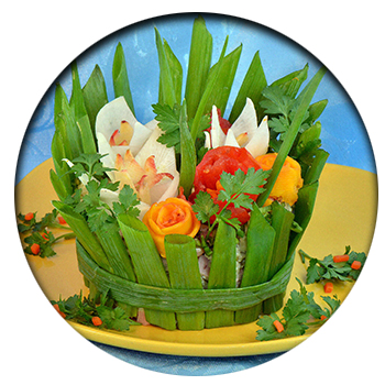 - Посыпать кунжутом. Украсить зеленью и различными цветочками, вырезанными из дайкона, редиски, помидора.