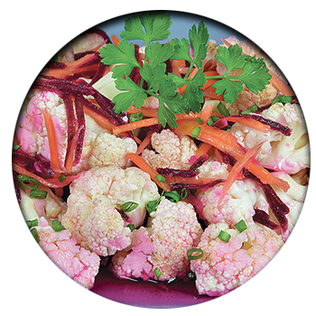 Капуста цветная – 2 кг, морковь (крупная) – 1 шт., свекла средняя – 1 шт., чеснок – 8-10 зубчиков, уксус – 2 ст. л., масло растительное – 0,5 стакана, соль (крупная) – 3 ст. л., сахар (по вкусу) – 0,5 стакана, паприка молотая (по вкусу) – 1 ст. л., перец чили молотый (по вкусу), вода кипяченая (тёплая) – 2,5 л.