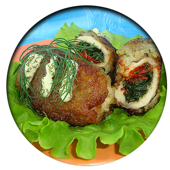 Куриное филе – 3 шт., шпинат свежий – 1 большой пучок, картофель – 4 шт. (крупных), яйцо куриное – 1 шт., перец болгарский красный – 0,25 шт., соль и перец по вкусу, масло сливочное – 1 ст. ложка, масло растительное для жарки – 100 мл, сыр твёрдый – 50 г.