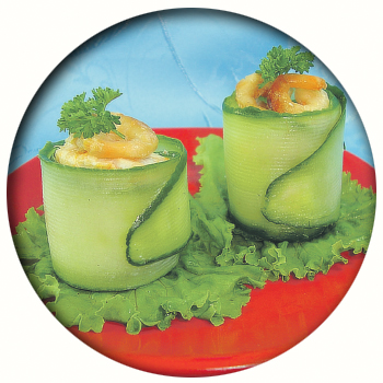 2. Огурец нарезать тонкими полосками с помощью овощечистки. Свернуть полоски огурца кольцами и заполнить их фаршем.