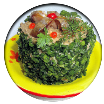 - Присыпать зелёным луком боковую поверхность. Украсить сверху зеленью, ломтиками сельди.