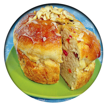 Опара: 120 мл тёплого молока, 15 г свежих дрожжей, 1 ст. л. сахара, 1 ст. л. муки. Тесто: 100 г сл. масла комнатной температуры, 2 яйца, 2 желтка, 60 г сахара, 450 г муки, 0,5 ч. л. соли, 240 г изюма и цукатов, 1 желток+1 ст. л. молока, сахарная пудра.