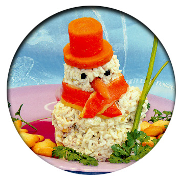 - Из варёной моркови вырезать шапку, сделать носик. Глаза из черного перца, шарфик из сыра с морковью. Вокруг снеговика положить крекеры – с их помощью закуску надо есть.