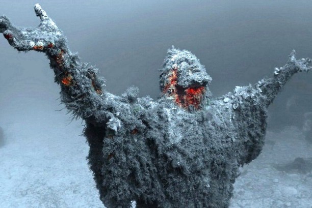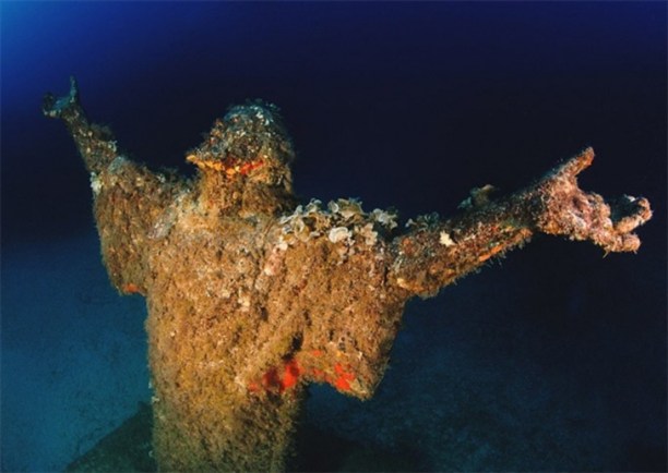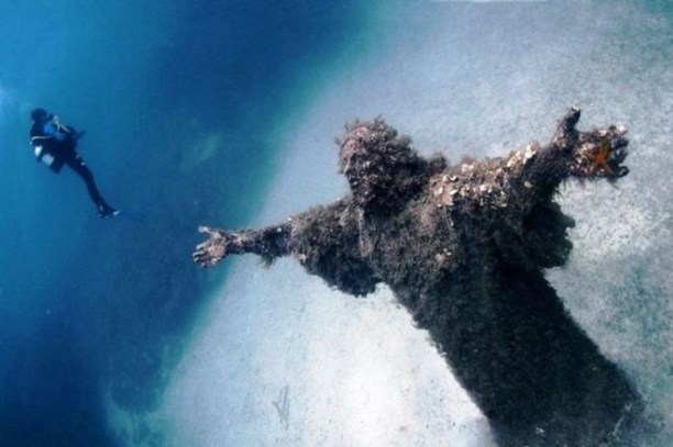 Двадцать второго августа тысяча девятьсот пятьдесят четвертого года, эту статую установили на глубине пятнадцати метров в заливе Сан-Фруттуозо, недалеко от Генуи в Италии. За пятьдесят пять лет, которые скульптура находится под водой, к ней погрузились около двух миллионов ныряльщиков.