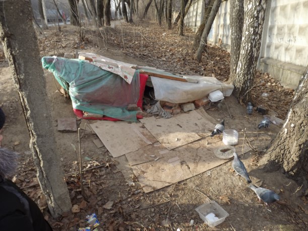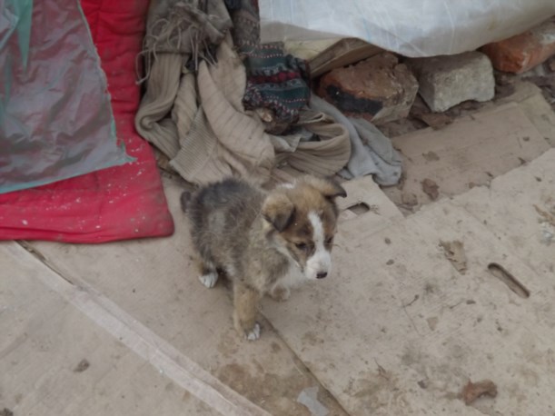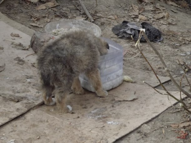 Добрые люди всё так есть! В этой «конуре» было очень много тёплых тряпок, простора и собачьего счастья! Видимо, своеобразный блиндаж уходит под землю, а внизу проходит теплотрасса. Недолго думая, мы решили вернуть щенка к его родственникам. Видно было, что их кормят, так как всё вокруг было в еде. Даже птицам хватало. Ну, и, естественно, мы тоже будем приносить еду всем!