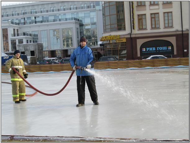 Заливают каток слоями. Льют через каждые десять минут, причем специальным рукавом из пожарной части, с насадкой для рассеивания воды.