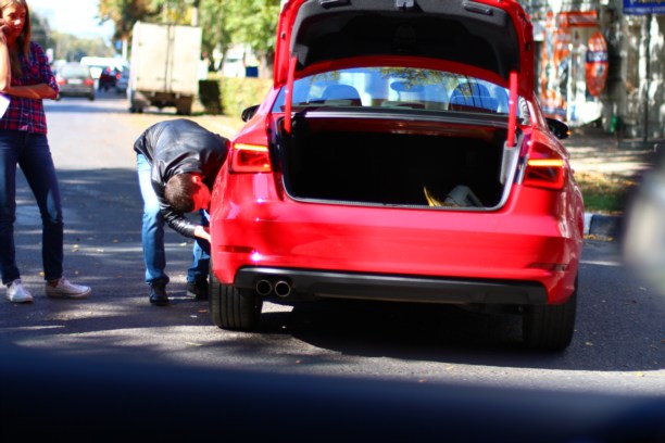 Результат ДТП — грубо отшлифованное заднее левое крыло Ауди и новый слой красивой красной краски (ой!) от немецкого авто-концерна на стареньком бампере автомобиля другого немецкого авто-концерна. На фото видно, что пострадавший автоджентлемен не верит своим глазам.