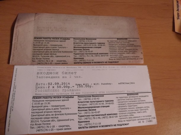 Недавно был с женой в Ясной Поляне, в усадьбы не заходим, но по парку очень часто прогуливаемся. И всё бы вроде как всегда, не попадись мне на глаза, сохраненная женой, квитанция о входе на территорию 2х летней давности. Обе квитанции на 2х человек. Но вот цена...