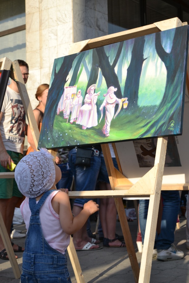 - Добрый вечер! Рисую я давно. Этот срок многие художники описывают как "всегда рисовала", но существуют такие моменты, когда художники впадают в ранний творческий кризис. Это происходит, когда школа и институт дали много техники, а ты не знаешь что с этим делать. И вот у меня несколько лет был такой сложный период, пока я однажды не пошла с подругой погулять, а на площади выступал уличный театр. Вот такая смелость выброса своего творчества на улицу - без билетов, без оплаты, без охраны, просто к людям - очень сильно поразила меня. После этого я начала ходить на подобные мероприятия, и пошла такая тема, что я начала делать наброски, потом пошли картины, и я приобщилась к этому уличному творчеству.
