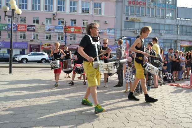 Площадка, привлекшая мое внимание, находилась у Главпочтамта. Свои программы представили энергичные ребята из коллектива "44 drums" и актеры театра "Nikoli".