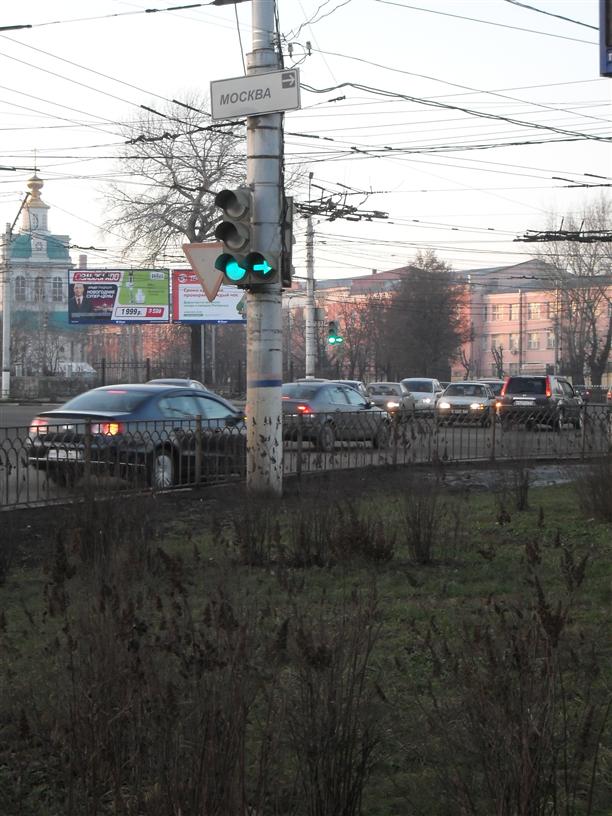 2. Когда загорается красный тем, кто едет с моста, а стрелка направо им горит, то они должны уступать дорогу тем кто продолжает движение через перекресток, т.е. тем, кто движеться по улице Металлистов в сторону улицы Лейтейзена/Фрунзе; и тем, кто поворачивает с трамвайных путей на Мосина в соответствии с пунктами правил 8.9 и 13.11 (изложены выше) и пунктом 13.5 “При движении в направлении стрелки, включенной в дополнительной секции одновременно с желтым или красным сигналом светофора, водитель обязан уступить дорогу транспортным средствам, движущимся с других направлений.”