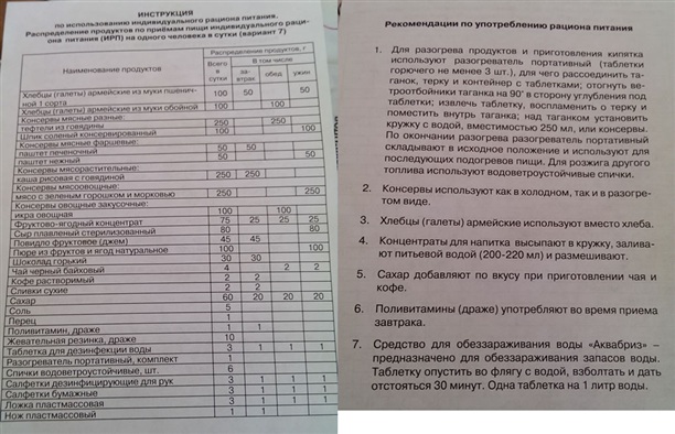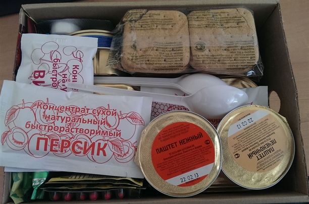 Итак, внутри: хлебцы (4 упаковки двух сортов), тефтели из говядины, шпик консервированный, паштеты (2 упаковки), рис с говядиной, мясо с зеленым горошком и морковью, икра овощная, ягодные концентраты (3 упаковки), сыр плавленый (стерилизованный), повидло, пюре из фруктов и ягод, горький шоколад, чай (4 пакетика), кофе (2 упаковки), сливки, сахар, соль, перец, поливитамин, жвачка Dirol, таблетки для дезинфекции воды, портативный разогреватель, спички водоветроустойчивые, салфетки, ложки и нож. Бойцам любезно положили инструкцию и распределение продуктов по приемам пищи. Приятно, что все перечисленное «на бумажке», совпадает с тем, что в контейнере.