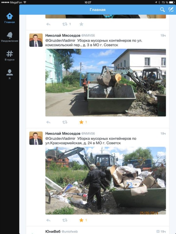 И вот сегодня захожу в твиттер и, о чудо, вижу, что наш мэр отчитывается Груздеву (губернатору области) о том, что в городе убирают крупногабаритный мусор.
