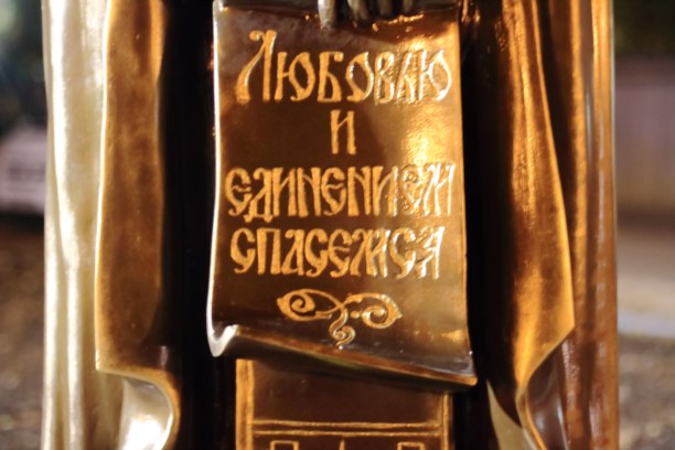 Сергий Радонежский считается небесным покровителем Плавского Района. Кстати, уже закончился ремонт стоящего рядом Сергиевского храма, построенного в 19 веке на деньги Князя Гагарина, супруга которого была евангелической верующей. Храм является объектом культурного наследия. Его можно красиво сфотографировать и поучаствовать в конкурсе от Википедии. Сам я не был на мероприятии, а сфотографировал новый культурный объект уже ночью. Посмотреть фоторепортаж о событии можно здесь. В руках Сергий держит такое послание для русского народа: