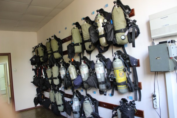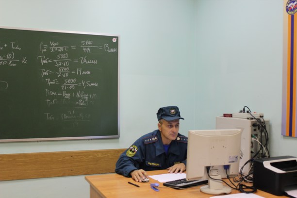 На доске в учебном классе нарисованы какие-то каракули. Оказалось, что эти самые каракули могут спасти жизнь пожарному. В тот день они разбирали, как рассчитать на сколько у тебя хватит воздуха в кислородном баллоне. Они, кстати, у каждого свои и пока спасатели отдыхают дома – баллоны спокойно висят на стене.