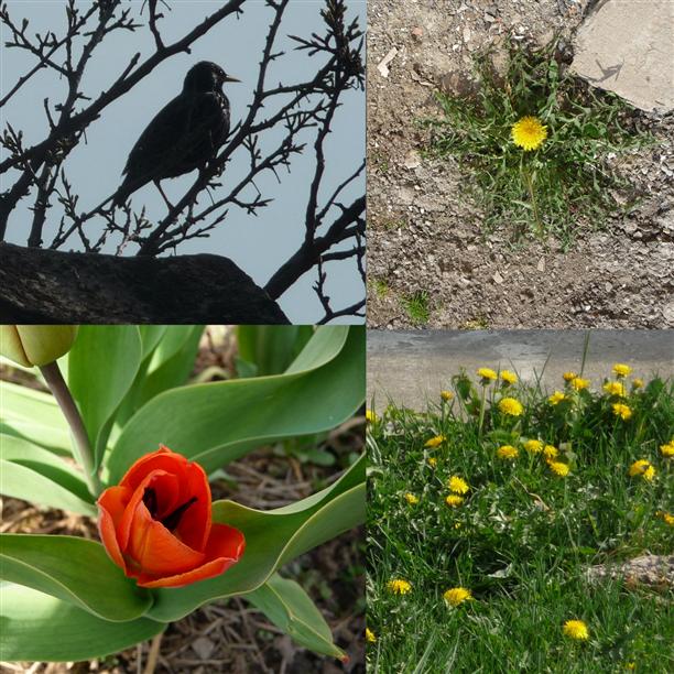 А параллельно, фоткаю всех тех, кто меня порадовал этим солнечным утром. Первый распустившийся тюльпан, птичка, говорят скворец, я в них не понимаю ничего, особенно понравился неожиданно распустившийся, одинокий одуванчик среди груды «бездушных» камней! От него заряд бодрости и гордости на весь день… И тут же более солидная «кучка» одуванчиков у соседей, у них они «дружнее»)))