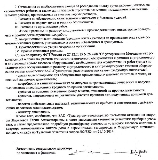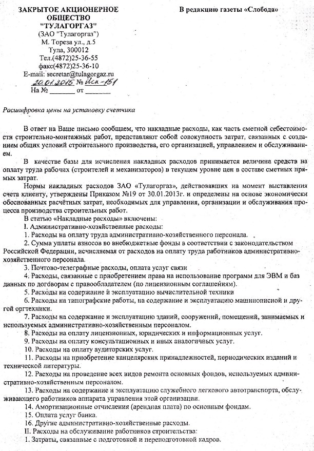 В плановом отделе «Тулагоргаза» нам по телефону пояснили, что «это расходы на бумагу для актов и перчатки для монтеров, а накопление – прибыль предприятия». Потом, спохватившись, сказали, что ответят письменно на наш запрос. И действительно, ответили – прислали выписку статьи из журнала «Финансовый директор» (прилагается).
