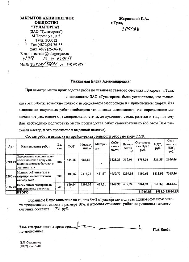 - Я как законопослушный владелец квартиры собиралась установить счетчик на газ, как велит федеральный закон. Вызвала техника для определения стоимости, его визит стоил 288 руб. Он озвучил сразу максимальную цену, которая у него была в прайс-листе – 11731 руб., объяснив ее необходимостью проведения сварочных работ. И это без стоимости самого счетчика, который стоит около 3 тыс. руб. Я обратилась в «Тулагоргаз», чтобы мне сделали калькуляцию работ. Вот что мне прислали: