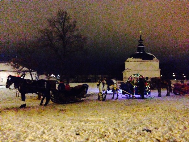 На торговой площади и у кремля наперебой зазывают совершить традиционную конную прогулку в санях.