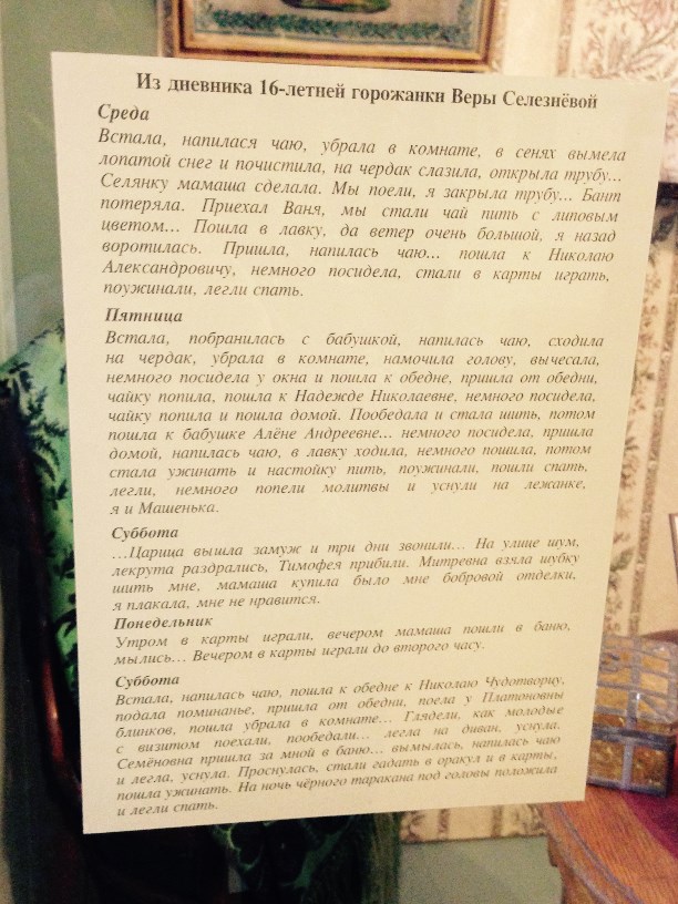 Не знала, куда приделать вот эту страничку из дневника жительницы Суздаля. Распорядок дня просто сразил. Впрочем, у некоторых жителей городка такой распорядок и по сей день. (из экспозиции в кремле)