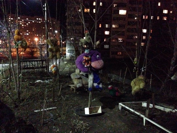 Веселый дворик где-то в районе ул. Бондаренко. Жутковатое зрелище. Пыточная для игрушек.