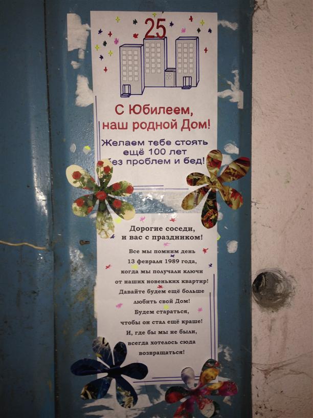 А вот в доме №78 по ул. Пузакова в Туле на днях отметили день рождения… этого самого дома! Вот такое поздравление было в подъезде.