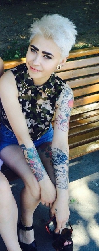Работала парикмахером, а сейчас – официант. Планирую вернуться к прежнему занятию. Количество татуировок сложно подсчитать, примерно 21.