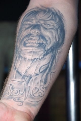 Однажды в 2008 году я пришёл в салон «ПроТату» делать татуировку у мастера Александра Шолохова (сейчас работает в Питере). В процессе работы я узнал о предстоящем тату-фесте, на котором Санёк должен был делать тату бесплатно своему другу. Но позже выяснилось, что этот друг сломал руку и не сможет быть моделью для работы. Санёк расстроился и начал ломать голову: где найти модель для работы. В этот момент я не растерялся и предложил ему своё тело для татуирования. Он согласился и теперь у меня на правой руке красуется портрет Джеймса Хэтфилда, вокалиста Великой группы Metallica. Сейчас я забиваюсь у Александра Лыкова.