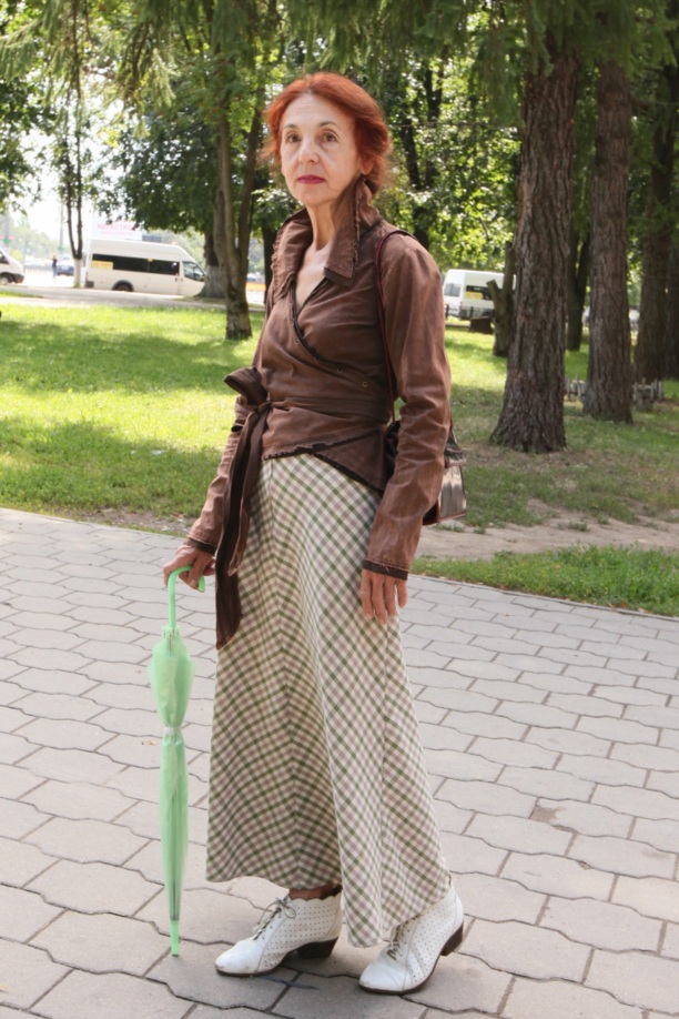 На Ларисе Николаевне: юбка, сшитая своими руками, безразмерная запашная блуза, купленная у знакомого дизайнера, сумка - подарок подруги, ботинки из тонкой натуральной кожи, ручная работа.